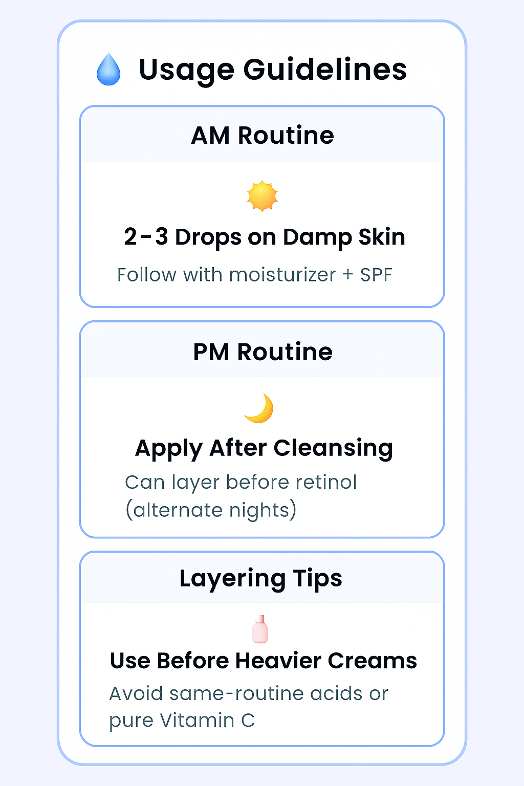 Apply 2–3 drops to clean, slightly damp skin once or twice daily. It layers well with other products, just apply before heavier creams or SPF. A little goes a long way, and one bottle typically lasts 4–6 weeks of consistent use.
