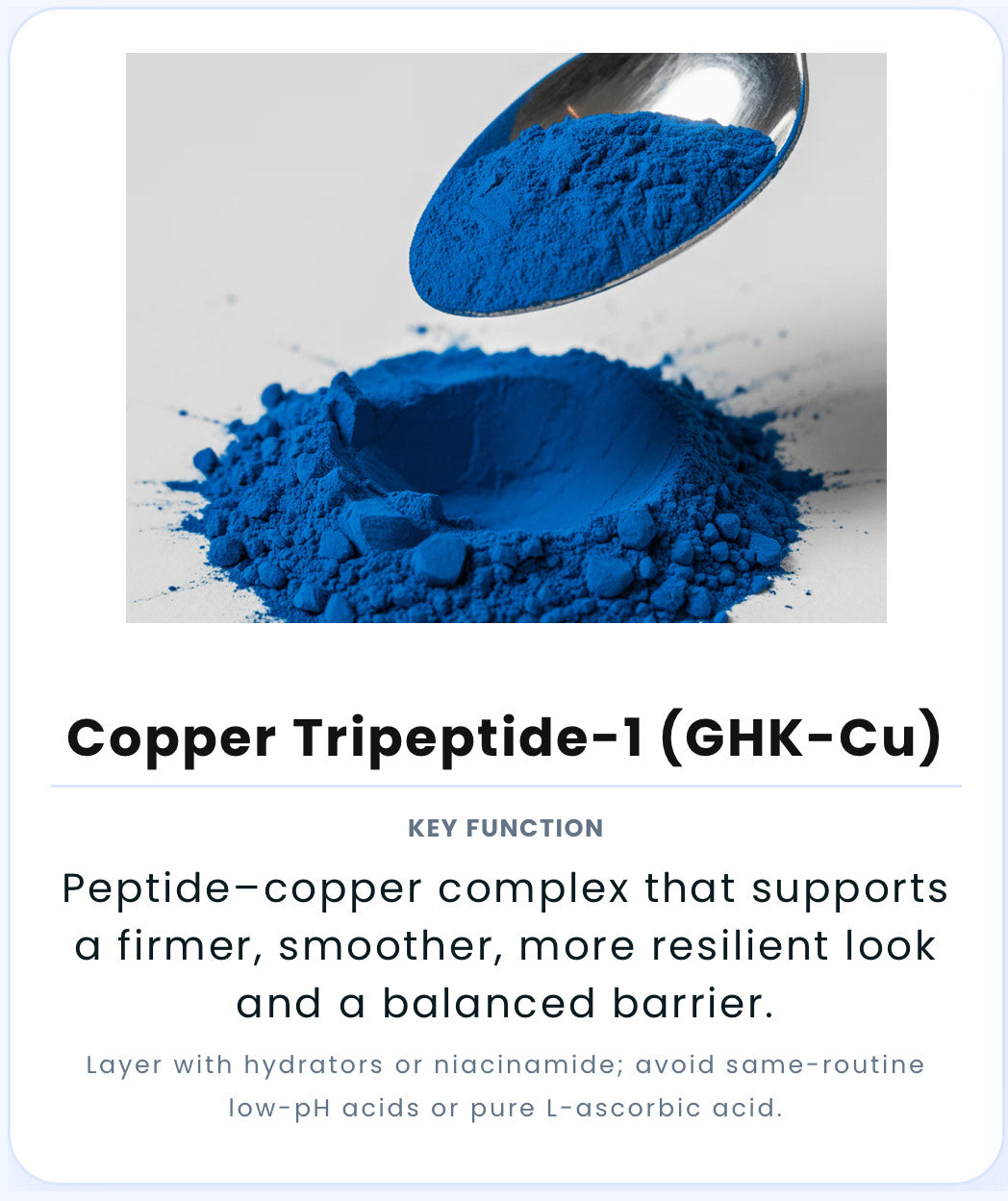 Copper peptides (GHK-Cu) are clinically proven to boost collagen and elastin production, helping firm the skin and reduce fine lines. They also accelerate cellular repair and improve microcirculation, which enhances your skin’s natural glow. Think of it as supporting your skin’s “rebuild and restore” system from within.